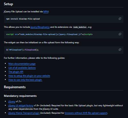 jQuery-File-Upload is a mature, full-featured jQuery plugin (often paired with server-side handlers) for handling file uploads from the browser with advanced capabilities. It supports chunked uploads, drag and drop, multiple file selection, progress bars, client-side image resizing, and preview generation. On the server side, artifacts may be processed using compatible back-end scripts in languages like PHP, Ruby, Node.js, or Java, making the plugin cross-platform. Because uploads can be large or unpredictable, the code is designed to gracefully recover from failures, allowing resumption or cleanup of incomplete parts. Custom callbacks and event hooks let developers validate files by size, type, or user permissions before upload, or abort and communicate errors. In practice, it’s widely used in content management systems, asset upload tools, and anywhere users must deliver files via web forms while receiving immediate feedback.