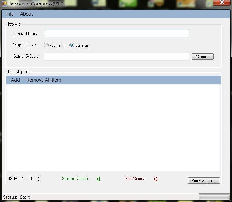 This program will provider you to compress javascript file . Before compress you can choose single file or muilt files . when you finish to compress , you can save it . Then next time , you just open someone project (File->Open Project).
