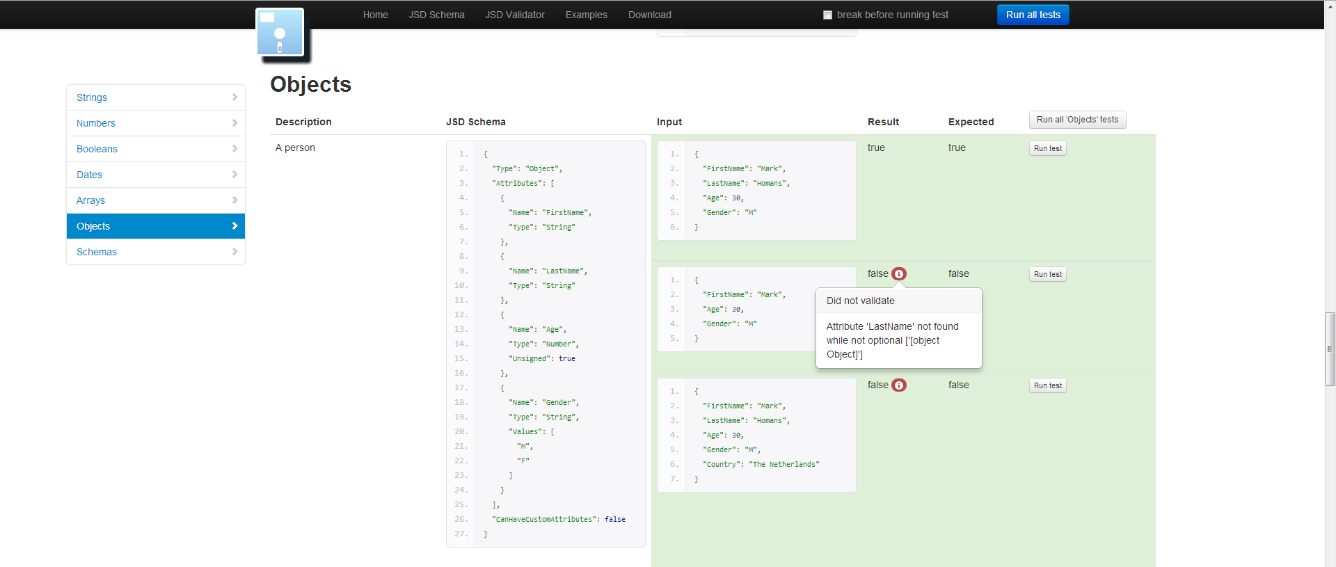 JSD does for Javascript what XSD does for XML. Create complete shemas and test if your objects validate with it.