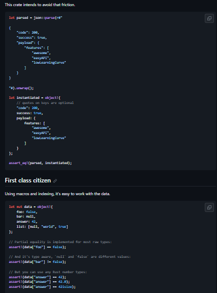 Parse and serialize JSON with ease. JSON is a very loose format where anything goes - arrays can hold mixed types, object keys can change types between API calls or not include some keys under some conditions. Mapping that to idiomatic Rust structs introduces friction.