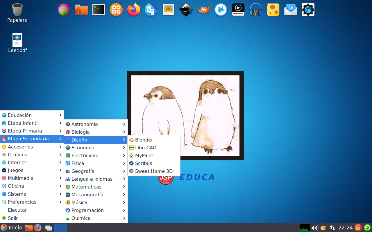 JSP-Educa es una distribución Gnu/Linux en español de ámbito educativo. Está enfocada tanto para profesores como para alumnos de todas las edades. Tiene versiones basadas en Debian y Devuan. Con soporte para arquitecturas de 64 y 32 bits.