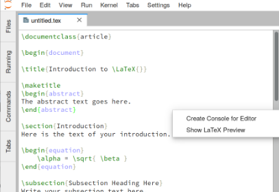 An extension for JupyterLab which allows for live-editing of LaTeX documents. To use, right-click on an open .tex document within JupyterLab, and select Show LaTeX Preview. This extension includes both a notebook server extension (which interfaces with the LaTeX compiler) and a lab extension (which provides the UI for the LaTeX preview). The Python package named jupyterlab_latex provides both of them as a prebuilt extension.