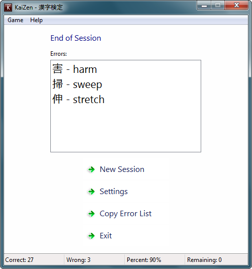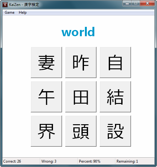 - Kanji to meaning. The meaning of the kanji is selected from a list of buttons.