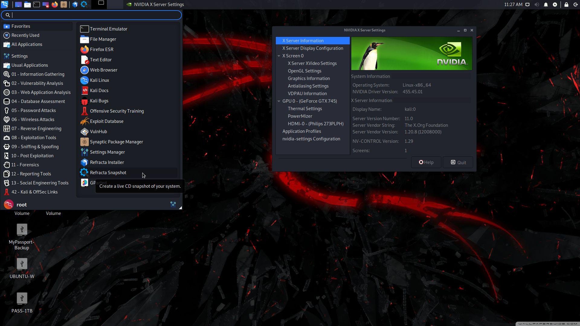 3. I have installed Nvidia’s Proprietary Graphics driver 455.45.01 so that you can use it while running Kali live (from a DVD or a USB stick). Watch this screenshot: : http://exton.se/kali/kali-rem-nvidia.jpg