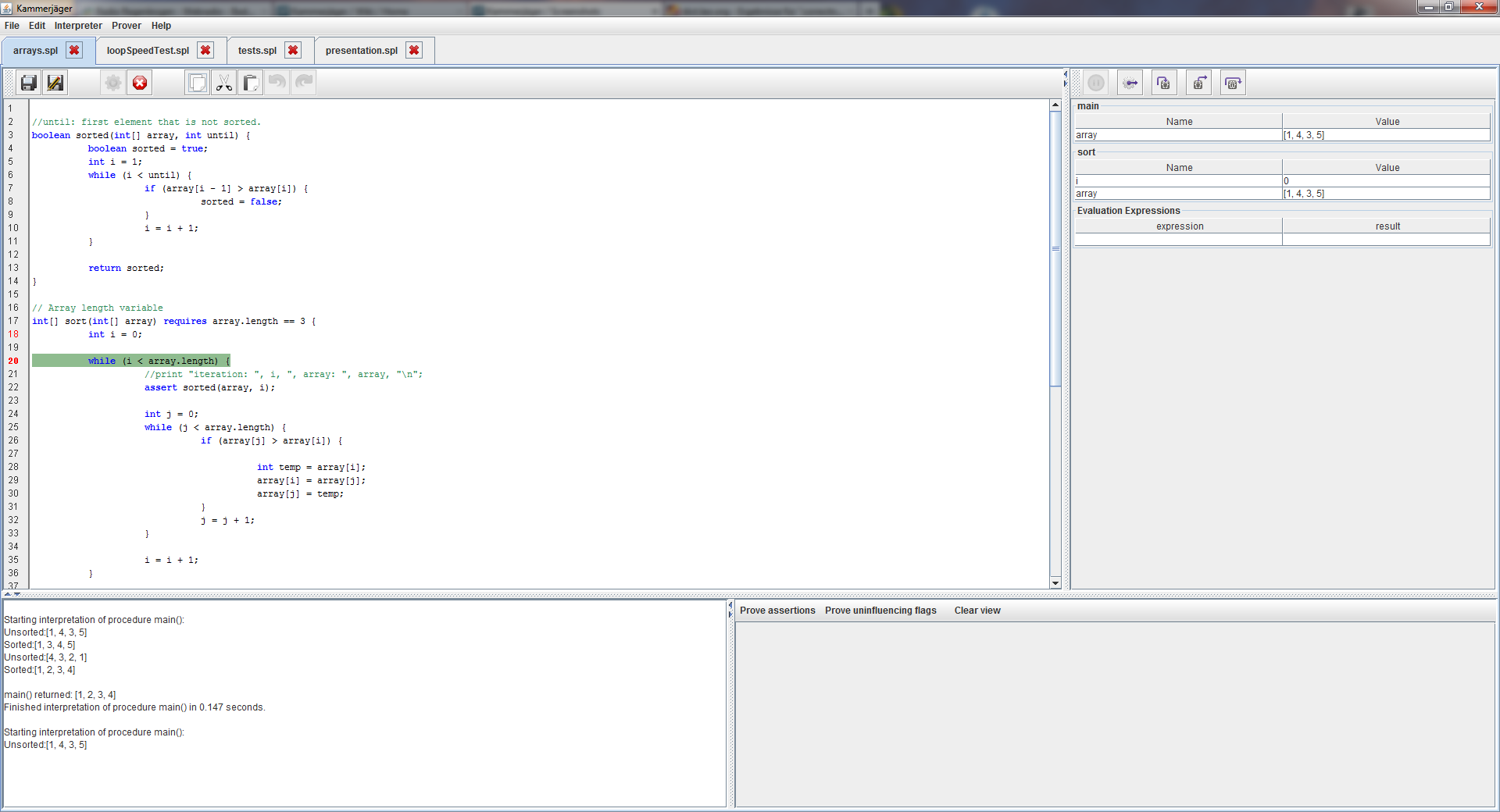 Kammerjäger is a debugging and testing tool that enables you to prove the correctness of your code. In our C like programming language named "SimPL" you can easily and simply annotate your code with preconditions and assertions (also with forall and exists expressions). We then use Microsofts Z3 theorem prover to prove if the behaviour of your program matches what you expected.