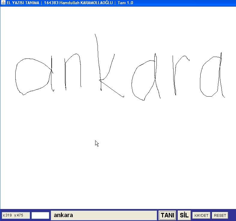 Bu çalışmada kullanıcının bir bilgisayar faresi yardımıyla el yazısı ile yazdığı sözcüklerin tanınması amaçlanmıştır. Karakter tanıma eğitimi aşaması sonrasında oluşturulan veritabanının gücüne bağlı olarak oldukça başarılı sonuçlar elde edilmiştir.