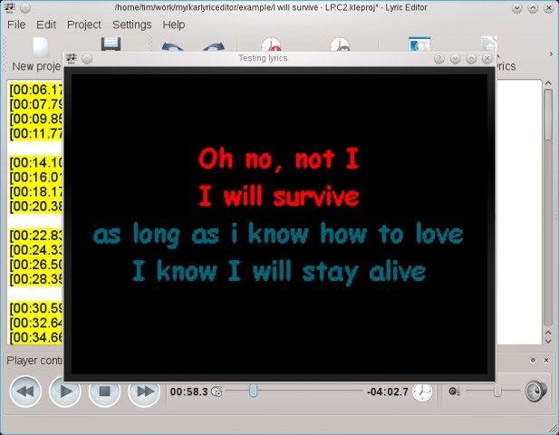 Karaoke Lyric Editor is Qt-based GUI application to edit and test Karaoke lyrics in popular lyric formats. Features full support for non-English languages, support for CDG, LRC and UltraStar specifics, and built-in karaoke testing window.