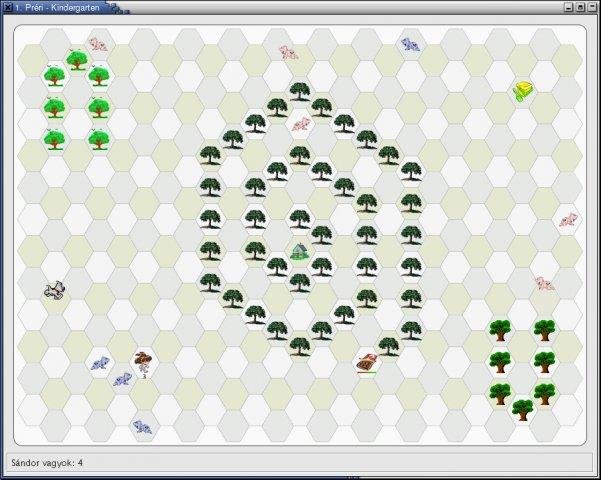 KGarten is a game where the player controls a nurse, whose goal is to collect the straggled children from the prairie and take them back to kindergarten. The prairie is tiled with hexagonal fields.