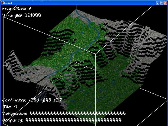 Khazad is a unique game engine intended to act as a testbed and example for 3D viewing, mouse based designations and AI for the independent game Dwarf Fortress.