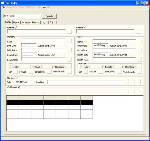 KINFINDER is a genealogical application. It allows you to store, edit, and research genealogical data, with similar functionality to other genealogical programs.