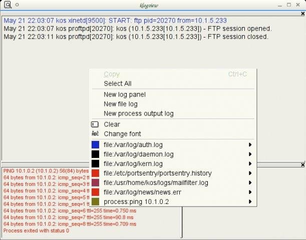 KDE real-time log file viewer. The main window contains any number of dockable log panels, each with arbitrary number of log sources. Every log source can have a separate font color and style, filters, alerts and encoding. Hides to tray.