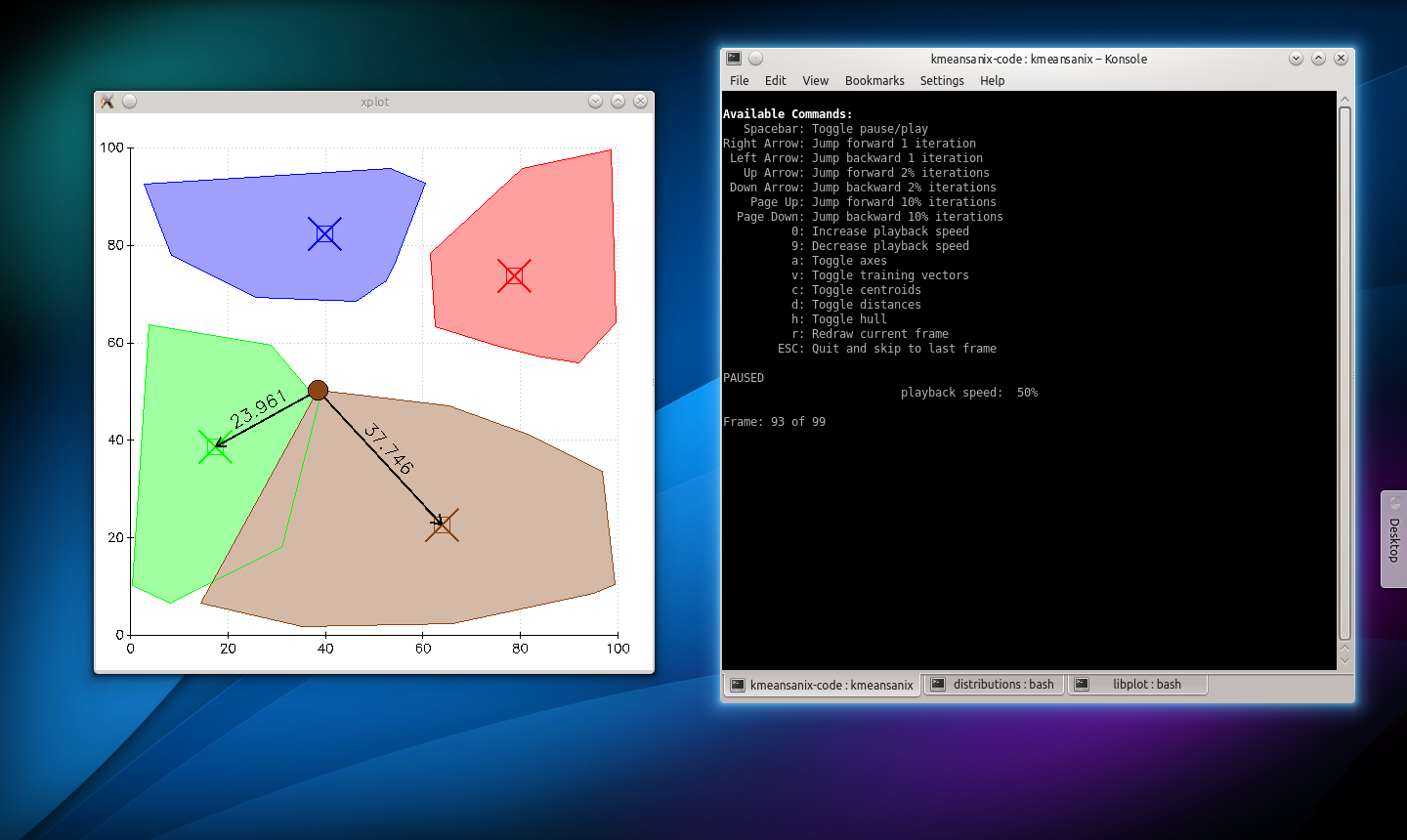 Open source animation of kmeans clustering in X Window System using the C++ libplotter library. Supports Linux, Mac, and BSD. Includes common initialization methods such as Forgy, Macqueen, random, and angular. Sample videos are available through the Files Tab above. The SVN repo is accessible thorugh the Code Tab above.