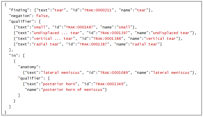 KneeTex is an open–source, stand–alone application for information extraction from narrative reports that describe an MRI scan of the knee. Given an MRI report as input, the system outputs the corresponding clinical findings in the form of JavaScript Object Notation objects. The extracted information is mapped onto TRAK, an ontology that formally models knowledge relevant for the rehabilitation of knee conditions. As a result, formally structured and coded information allows for complex searches to be conducted efficiently over the original MRI reports, thereby effectively supporting epidemiologic studies of knee conditions.