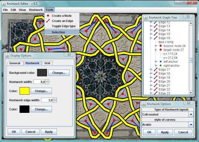 Knotwork is a graphical application to create knotworks in a celtic, arabic or viking style. User draws a graph defined by vertices and edges, which gives the basis for building the knotwork. Web page: http://knotwork.sourceforge.net/index.html