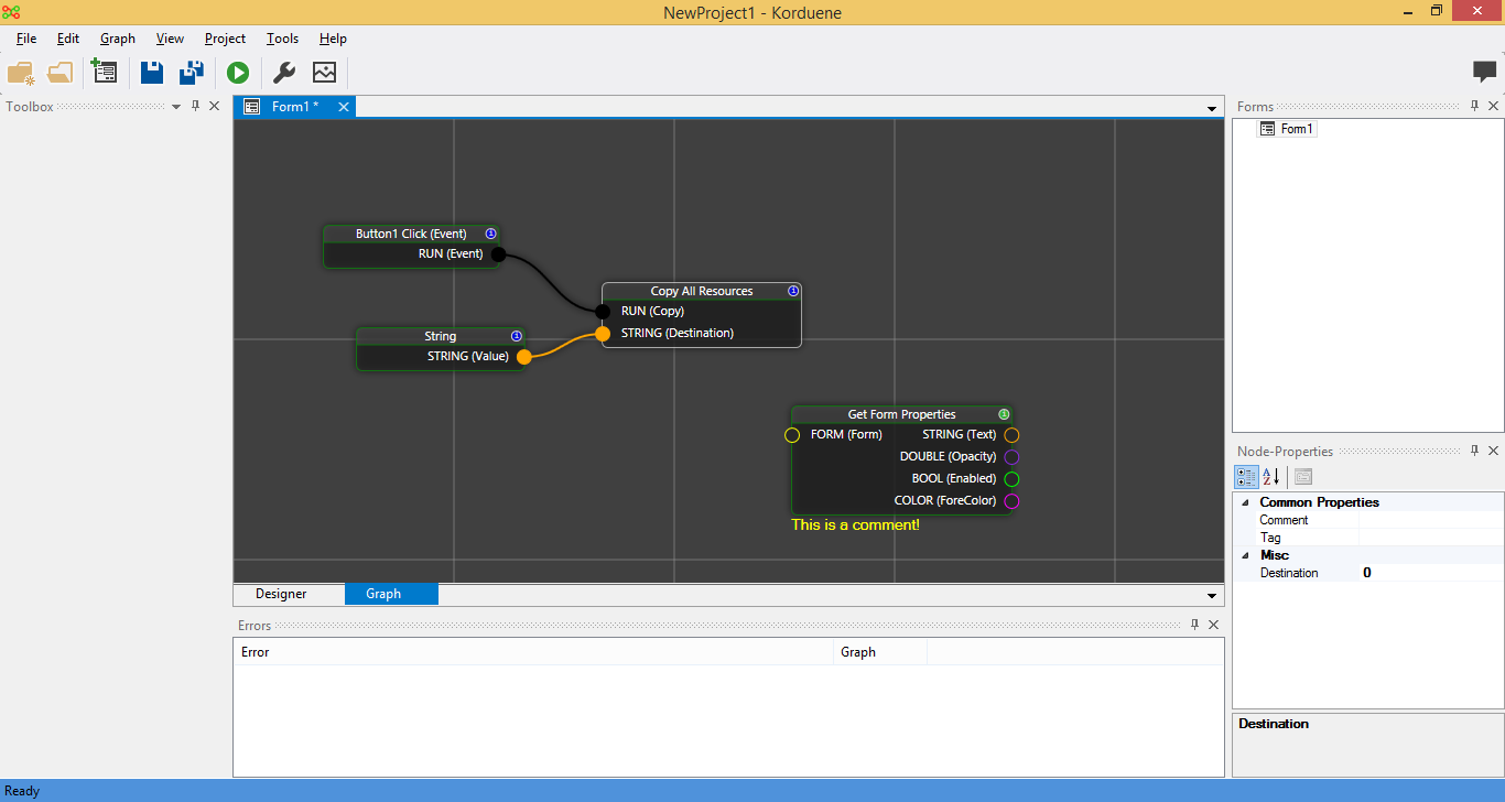Korduene is a visual programming IDE, that lets you create applications without having to know any programming languages, or any previous coding experience, Korduene currently only supports creating windows applications, however there are big plans for the future where Korduene could support other types of projects, or even games. Korduene is currently developed by Rebin, a senior programmer, currently a freelancer and actively developing Korduene.