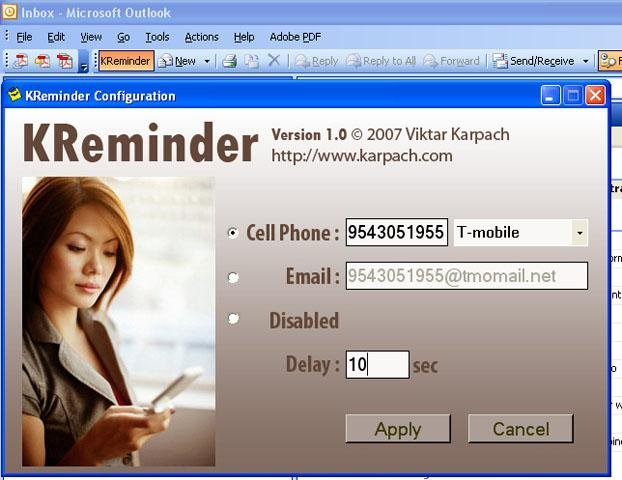 KReminder is outlook add-on, which sends reminders by email if they are not dismissed by user in specified amount of time. You can select different cell phone carriers such as T-Mobile, Sprint, Verizon and etc or regular email.
