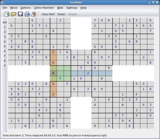 ksudoku is a fully-featured Sudoku puzzle generator and solver for KDE. With it you can generate and play 3D and 2D puzzles of different sizes and levels. The main algorithm is fast and extendable to any general graph coloring problem.