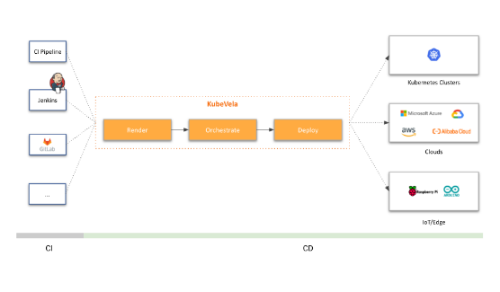 KubeVela is a modern software delivery platform that makes deploying and operating applications across today's hybrid, multi-cloud environments easier, faster and more reliable. KubeVela is infrastructure agnostic, programmable, yet most importantly, application-centric. It allows you to build powerful software, and deliver them anywhere. Declare your deployment plan as workflow, run it automatically with any CI/CD or GitOps system, extend or re-program the workflow steps with CUE. Glue and orchestrate all your infrastructure capabilities as reusable modules and share the large growing community addons. No ad-hoc scripts, no dirty glue code, just deploy. The deployment workflow in KubeVela is powered by Open Application Model.