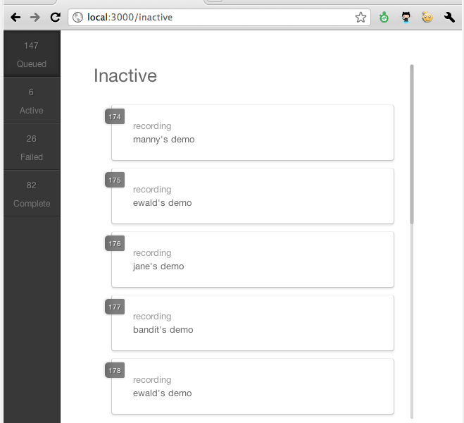 Kue is a feature rich priority job queue for node.js backed by redis. A key feature of Kue is its clean user-interface for viewing and managing queued, active, failed, and completed jobs. At any point in the job's life-time you can view verbose details, including the job's arbitrary data, creation, update, failure, and completion times. Jobs may incrementally update their progress, providing vital feedback for long-running tasks. Job-specific logging allows you to see how your job's are progressing, or any hiccups they may encounter. With Kue you can schedule jobs to run at any time in the future, a simple yet powerful feature, showing you in real-time when the job will be scheduled. With the UI's action panel you can filter jobs by type and alter sorting at any time.