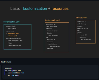 kustomize lets you customize raw, template-free YAML files for multiple purposes, leaving the original YAML untouched and usable as is. kustomize targets Kubernetes; it understands and can patch Kubernetes style API objects. It's like make, in that what it does is declared in a file, and it's like sed, in that it emits edited text. The kustomize build flow at v2.0.3 was added to kubectl v1.14. The kustomize flow in kubectl remained frozen at v2.0.3 until kubectl v1.21, which updated it to v4.0.5. It will be updated on a regular basis going forward, and such updates will be reflected in the Kubernetes release notes. In some directory containing your YAML resource files (deployments, services, configmaps, etc.), create a kustomization file. The resources in this directory could be a fork of someone else's configuration. If so, you can easily rebase from the source material to capture improvements, because you don't modify the resources directly.