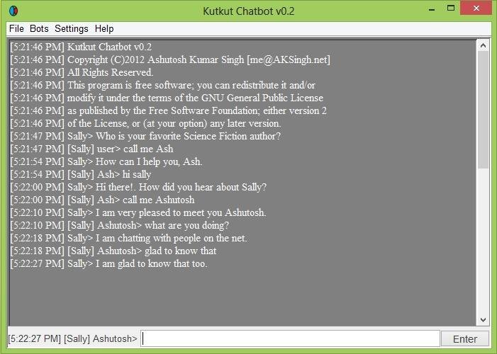 - Sally bot, Kutkut's own customized version of Alice bot