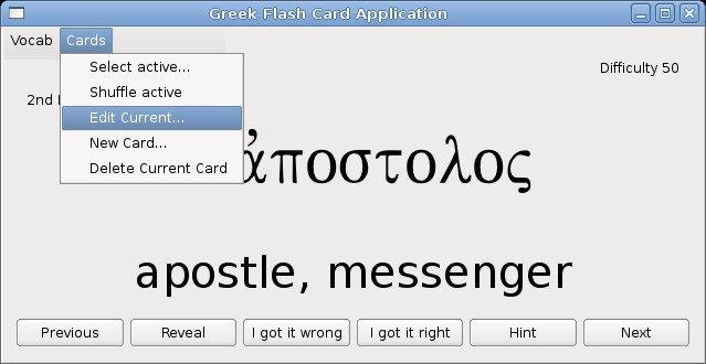 Learn vocabulary in any language. Create and edit your own set of flashcards. Filter them and shuffle them. Add hints and mnemonics. Fully configurable. This project has been moved to Google code, and it is now called Flashblack.