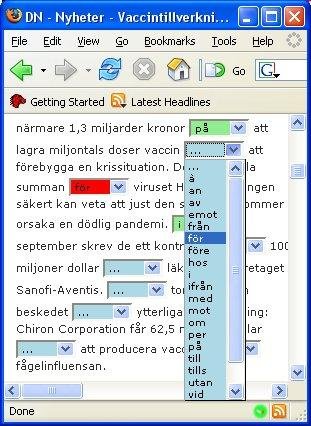 A Firefox extension that turns ordinary web pages into exercises for learning a foreign language (for example by replacing prepositions with scroll boxes).