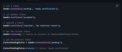 Imagine you want to have an Eloquent model hold a status. It's easily solved by just adding a status field to that model and be done with it. But in case you need a history of status changes or need to store some extra info on why a status changed, just adding a single field won't cut it.