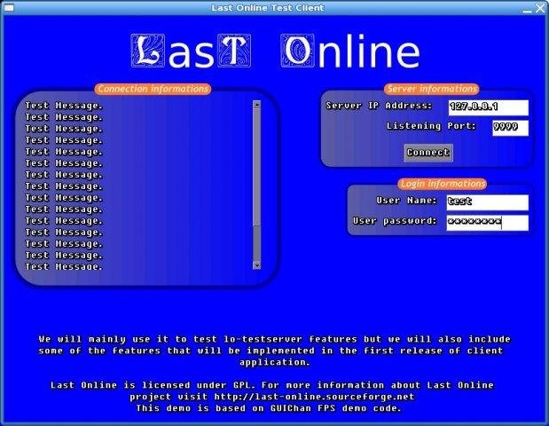 Last Online is a free and open-sourced MMORPG game. It consists in two main modules, a server and a client to play with. It is inspired by Ultima Online game but tries to implements a new gameplay and a better gaming experience.