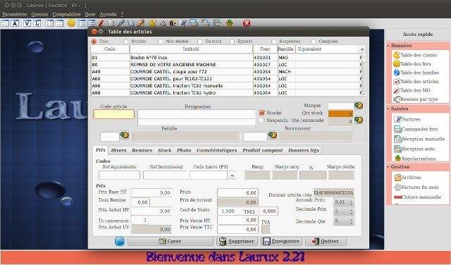 Laurux est un logiciel de gestion d'entreprise (ERP) permettant d'effectuer l'essentiel des taches afin de gérer d'une façon optimale votre comptabilité, votre facturation et votre stock.
