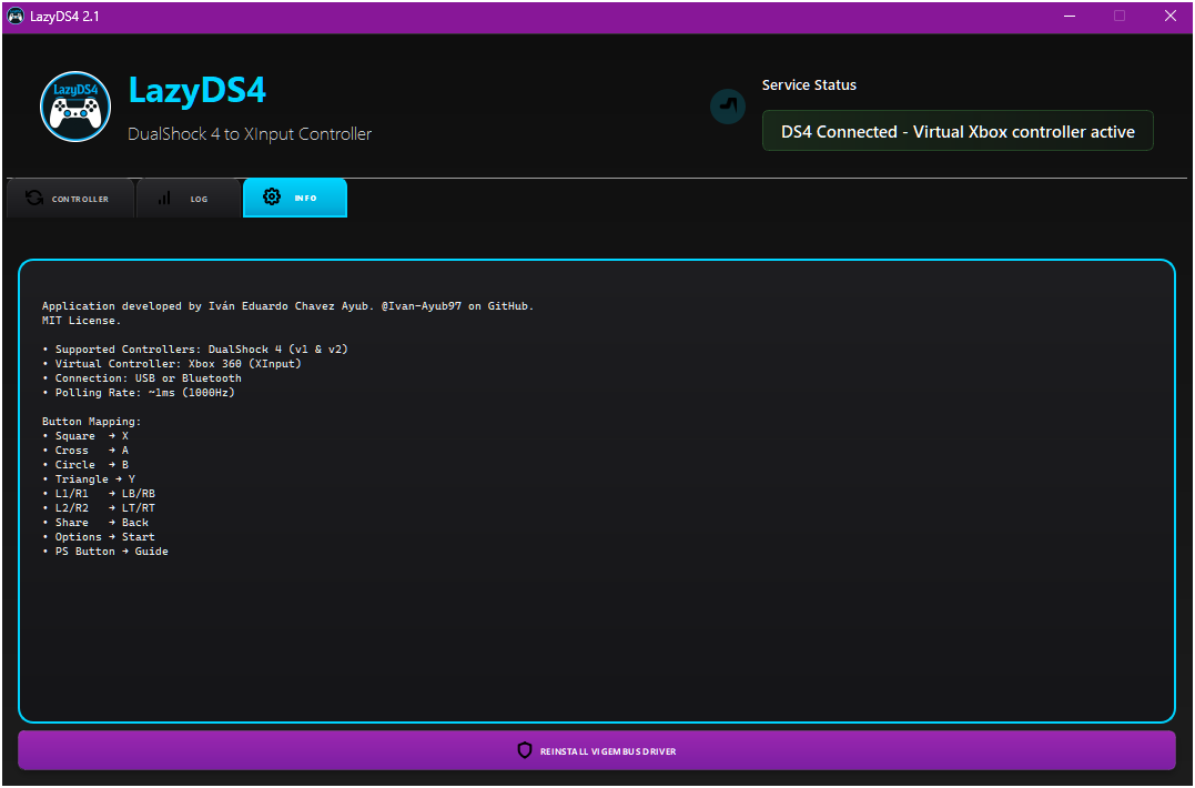 LazyDS4 is a controller mapping application designed to convert HID input from a DualShock 4 controller directly to a virtual Xbox 360 controller. Optimized for simplicity and performance, it offers real-time input mapping with a ~1ms (1000Hz) polling rate, modern graphical interface with PyQt5, and automatic joystick calibration.