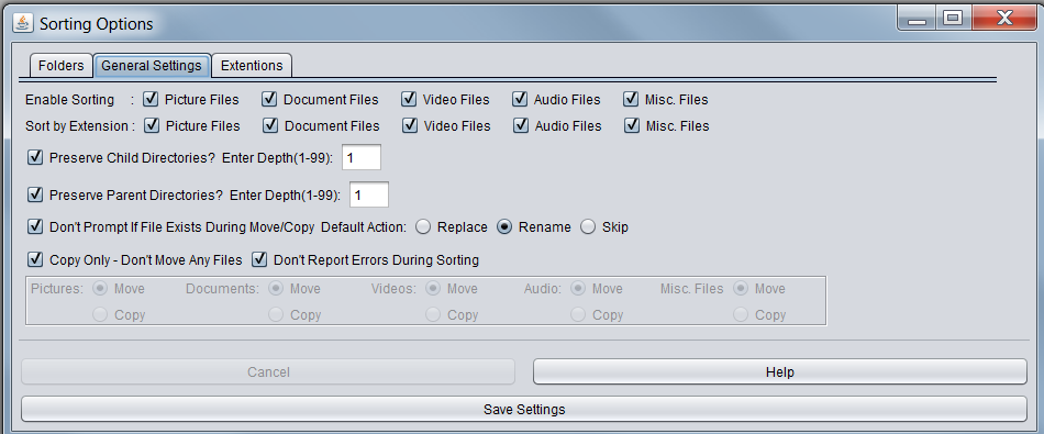 Lazy File Sorter will check files by their extension and move or copy them into their specified output folder. Lazy File Sorter was written in java and works on linux and windows.