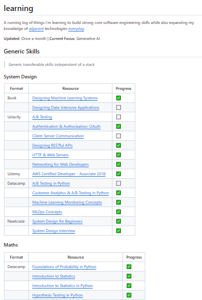 The learning repository by Amit Chaudhary is a continuously updated log of concepts, technologies, and skills related to software engineering and computer science. Rather than being a traditional software library, the repository acts as a structured knowledge base documenting the author’s ongoing learning journey across topics such as programming, system design, machine learning, and generative AI. The content is organized into categories that cover both core engineering skills and adjacent technologies, enabling readers to follow a practical roadmap for developing strong technical foundations. The repository emphasizes clear explanations, curated resources, and concise notes designed to help developers learn complex topics efficiently. Because it is updated regularly, it reflects evolving trends in software engineering and emerging technologies such as modern AI systems.