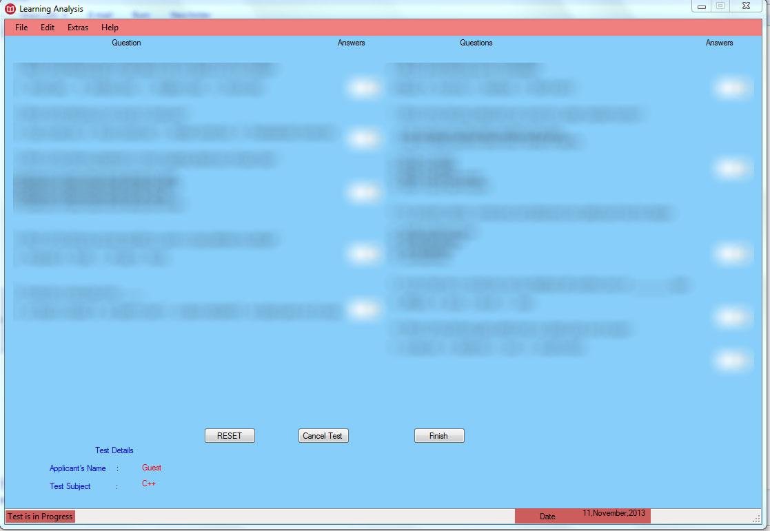 Learning analysis is a Windows Desktop Application.It Facilitates the learning analysis for C++ and JAVA subjects.The Application allows a student to submit his/her name & choose the test subject.The user can then attempt his test containing 10 Multiple Choice Questions containing 4 choices for each question.The user can also choose extras like Notepad,Calculator.It is Built using Visual Basic 2012 Technology.