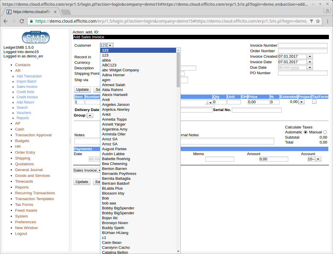 LedgerSMB is an ERP, featuring accounting (including AR, AP, and GL), quotation and order management, and more, for businesses with small to medium transaction volumes. The system has been shown to easily handle thousands of AR/AP transactions per week.