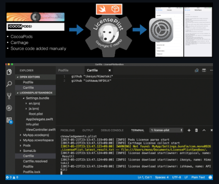 LicensePlist is a command-line tool that automatically generates a Plist of all your dependencies, including files added manually(specified by YAML config file) or using Carthage or CocoaPods. All these licenses then show up in the Settings app. Excludes can be defined to exclude matching libraries from the final output. An exclude is a dictionary containing any combination of name, source, owner, or licenseType. If a library name is unsuitable for the output bundle, you can explicitly rename it. This can be used when a library name is too vague, or if more human-readable names are needed. If you need to include a license that isn't available on GitHub, you can place the license text in the config file to be included in the output. The license text can also be read from a local file, to keep the config file clean.