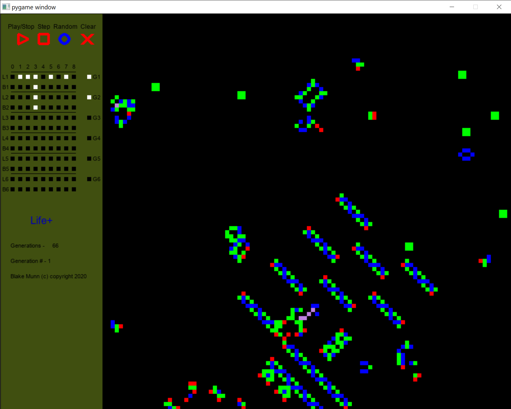 - - Play/Stop button and Clear button to clear grid and reset counters