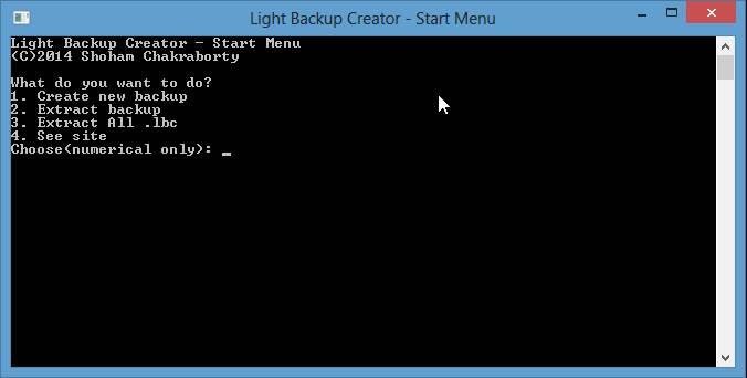 Light Backup Creator BETA is a light weight and handy tool for all. It is fast portable and can be used on almost all computers. This is still in BETA so I plan to add more features. You can help me out in the forums, telling me what I can add. I also want to make a GUI for this once this version is successful. Thanks for downloading and supporting!!