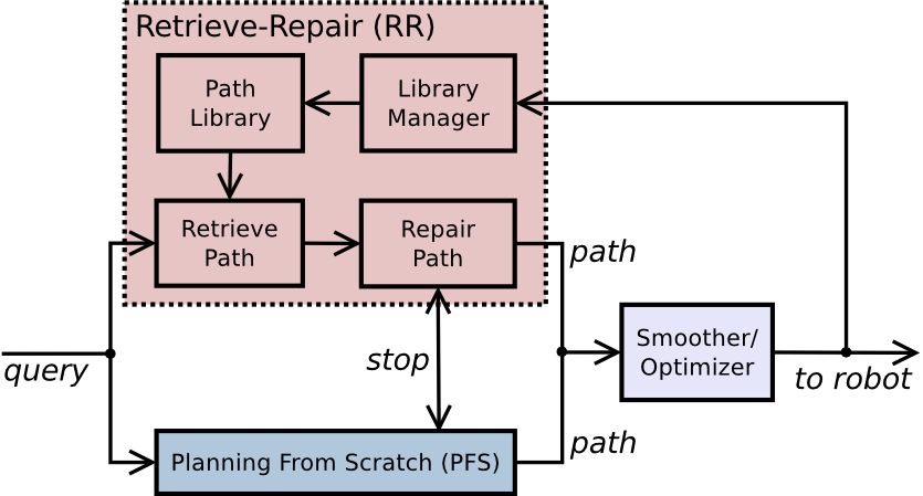This approach uses a path library to store previous experience while allowing generality by also planning from scratch. Please see the paper below for more details: