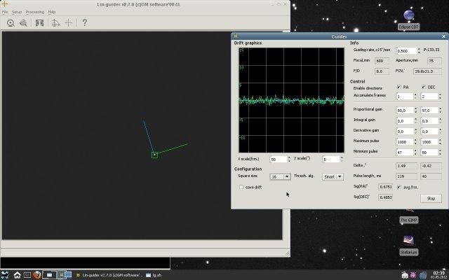 Lin-guider is an astronomical autoguiding program for Linux. It supports Philips, Logitech, uvc webcams, QHY5, QHY6, DSI2PRO, QHY5L-II-M, QHY5L-II-C, QHY5-II, ATIK, Starlight Xpress, ZWO ASI astrocams for video and FTDI chip-based, parallel port-based (LPT), GPIO-based, GPUSB devices, Nexstar-protocol based and QHY5, QHY6, QHY5L-II-M, QHY5L-II-C, QHY5-II, ATIK, Starlight Xpress, ZWO ASI astrocams for pulse guiding.