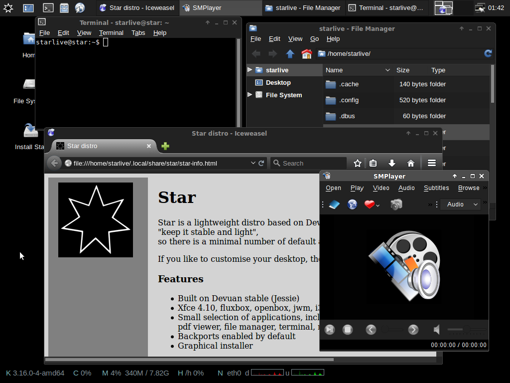 An exemplary distribution, simple and yet very dependably strong. Low resource consumption. Running Star Xfce & Star Openbox, one on my desktop, and the other on my laptop! Learned of Star on DistroWatch and had put off running a test install to see how well it performed, it did exceptionally well indeed. Keep up the excellent work and thank you!