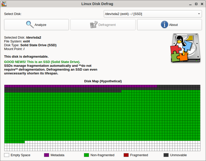 The program doesn't let you defragment your SSDs. It also tells you that it's not possible on non-EXTFS disk structures like SWAP and NTFS.http://e2fsprogs.sourceforge.net/