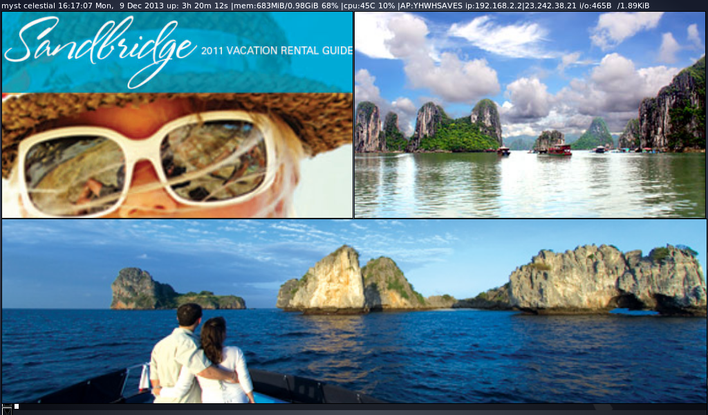 Linux Myst is targeted at visual content display and operations (automation soon) for information and display kiosk, heavy desktop work and trade-show and virtual product and visual advertising display.