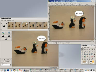Stopmotion is a Free Software application for creating stop-motion animated movies. It lets you create an animation from pictures captured from a webcam, a videocamera or from pictures imported from the harddrive, add sound effects and export a file.