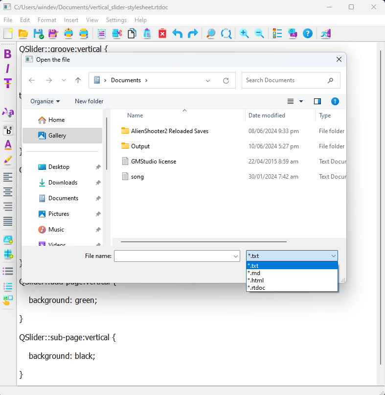 Key features include a minimalistic interface and support for common formats such as TXT, Markdown, HTML and its custom format 'rtdoc', which allows rich text editing. Including are also basic formatting options, inserting graphics, bullets, numbered lists and checkboxes.