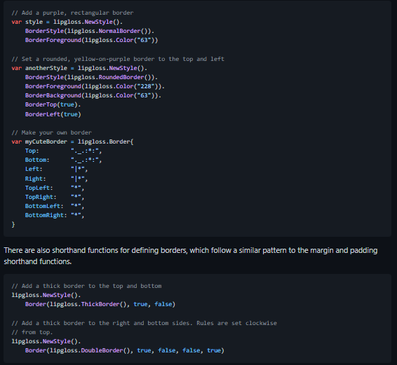 Style definitions for nice terminal layouts. Built with TUIs in mind. Lip Gloss takes an expressive, declarative approach to terminal rendering. Users familiar with CSS will feel at home with Lip Gloss. The terminal's color profile will be automatically detected, and colors outside the gamut of the current palette will be automatically coerced to their closest available value. The terminal's background color will automatically be detected and the appropriate color will be chosen at runtime. There are also shorthand functions for defining borders, which follow a similar pattern to the margin and padding shorthand functions. Sometimes, such as when developing a component, you want to make sure style definitions respect their intended purpose in the UI. This is where Inline and MaxWidth, and MaxHeight come in.