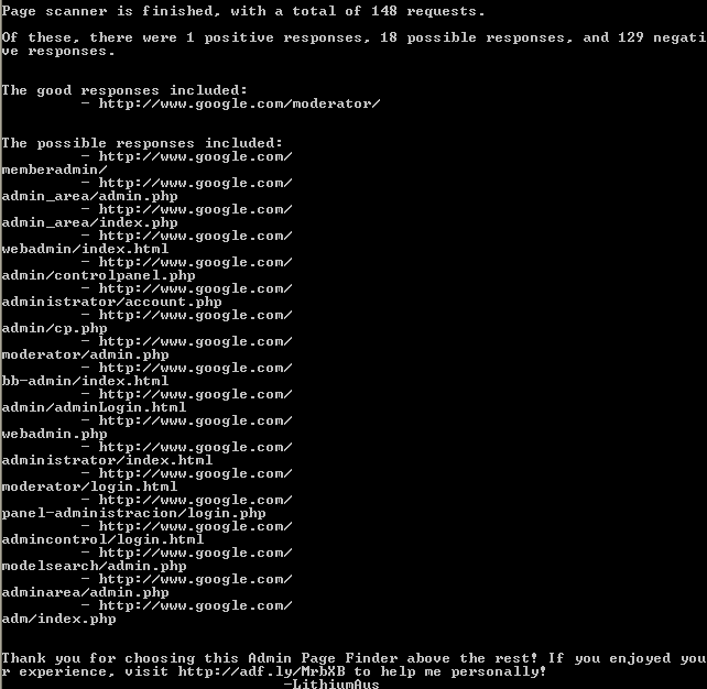 This admin page finder is very fast and efficient, and easy to customize, making a normally annoying task take as little as a few seconds!