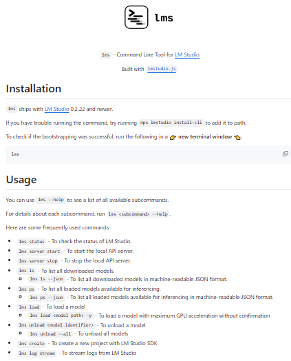 lms is a command-line interface tool designed to interact with and manage local large language models through the LM Studio ecosystem. The tool allows developers to control model execution directly from the terminal, providing programmatic access to features that are otherwise available through graphical interfaces. Through the CLI, users can load and unload models, start or stop local inference servers, and inspect the inputs and outputs generated by language models. LMS is built using the LM Studio JavaScript SDK and integrates tightly with the LM Studio runtime environment. The interface is designed to simplify automation workflows and scripting tasks related to local AI deployment. By exposing model management capabilities through command-line commands, the tool enables developers to integrate local LLM operations into development pipelines and backend services. As a result, LMS acts as a bridge between interactive local AI tools and automated software development workflows.
