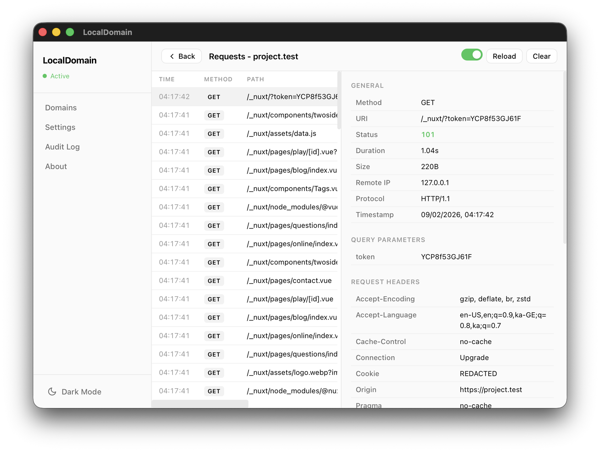 LocalDomain is a desktop application that simplifies local development by letting you create and manage custom local domains. It handles hosts file entries, generates trusted SSL certificates via a local CA, manages a reverse proxy (Caddy) daemon, and provides access/audit logging — all through an intuitive GUI. Built with Tauri, React, and Rust.