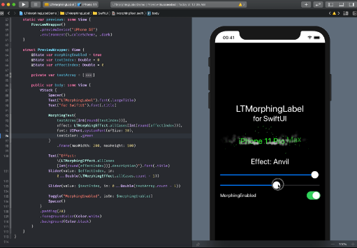 A morphing UILabel subclass written in Swift. The .Scale effect mimicked Apple's QuickType animation of iOS 8 of WWDC 2014. New morphing effects are available as Swift extensions. XCFramework is a new option introduced in Xcode 11. You can manually download the pre-compiled LTMorphingLabel.xcframework.zip from the Releases page. Then drag and drop it into your project. Change the class of a label from UILabel to LTMorphingLabel. Programmatically set a new String to its text property. To use interactively, call .pause() after changing .text property, and use updateProgress(progress: Float)to update the progress interactively. Even though this lib was used in a few products on App Store, it’s still an experimental project.
